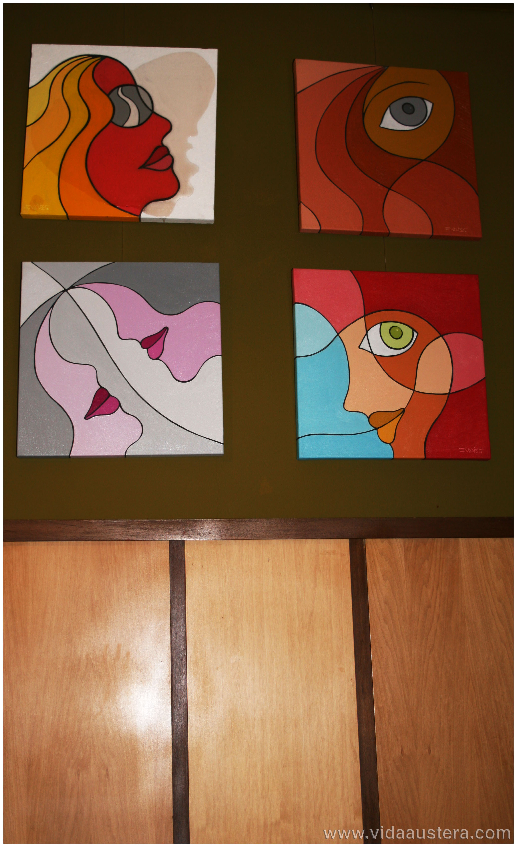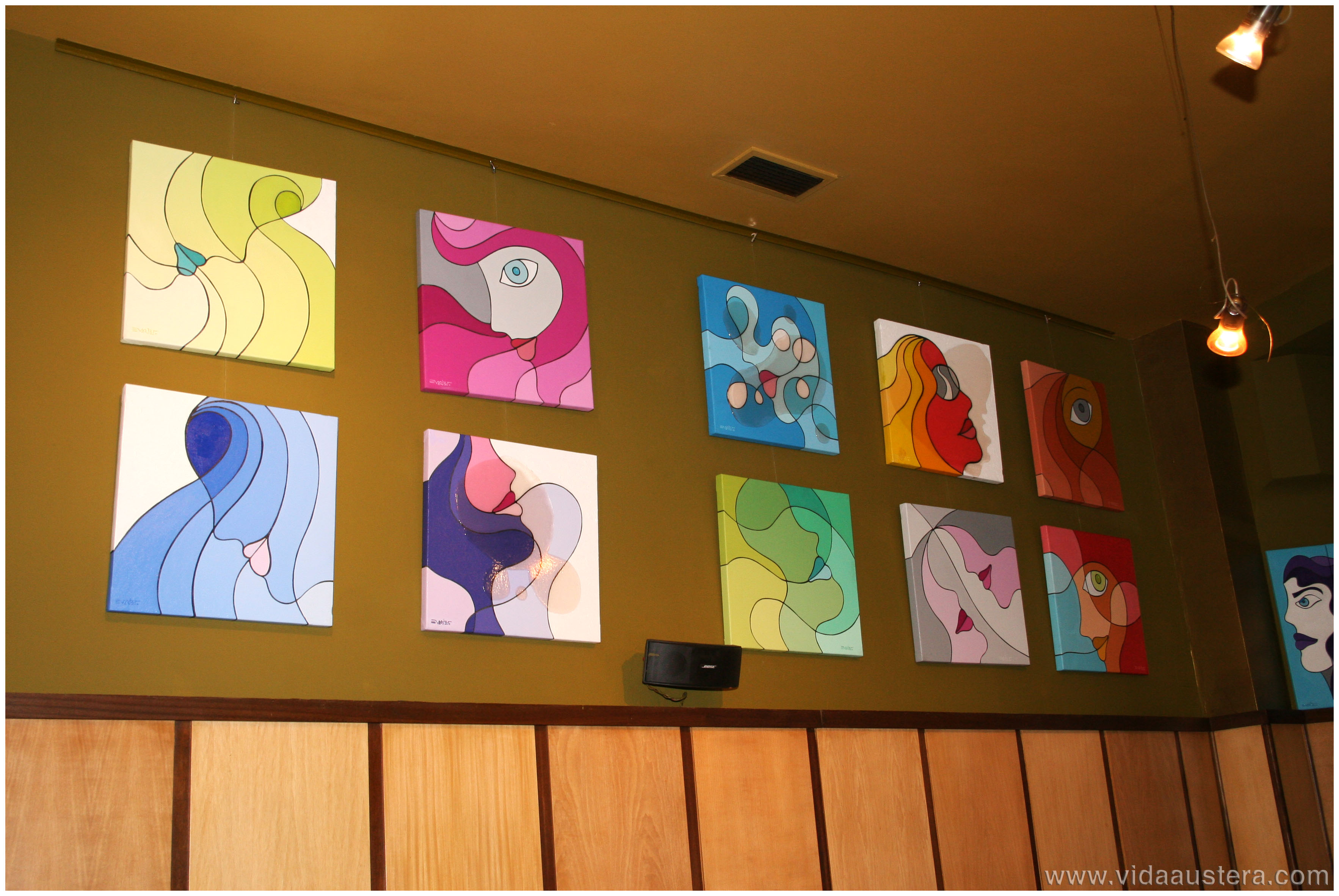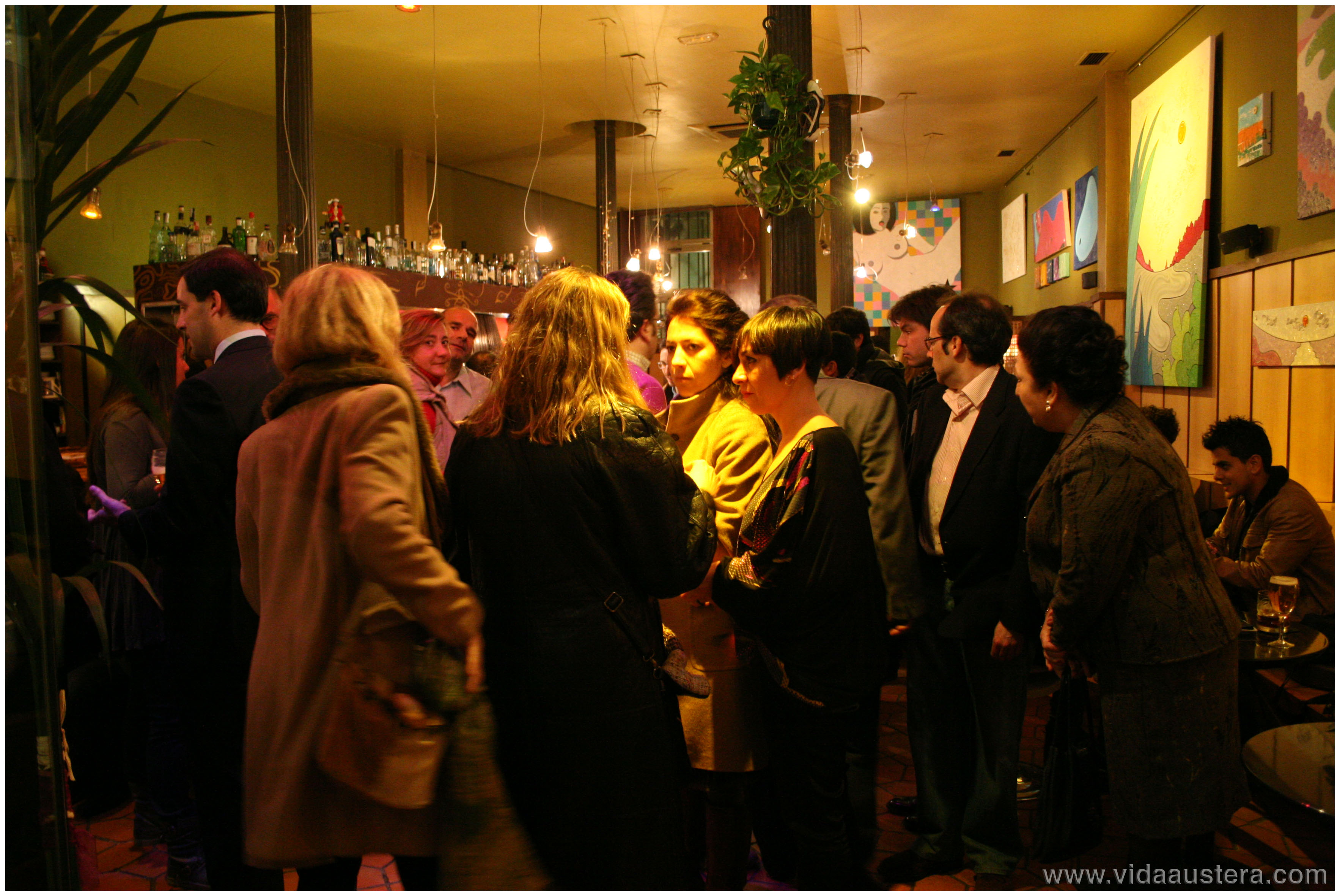 Los amantes a la pintura y los fans de Evaristo Jesús nos dimos cita para comprobar cuan divertidos son sus cuadros. Además las atrevidas mezclas cromáticas realizadas por la diseñadora de interior Estrella Sarmiento, se suman a las aportaciones de texturas, confiriendo volumen a las piezas.